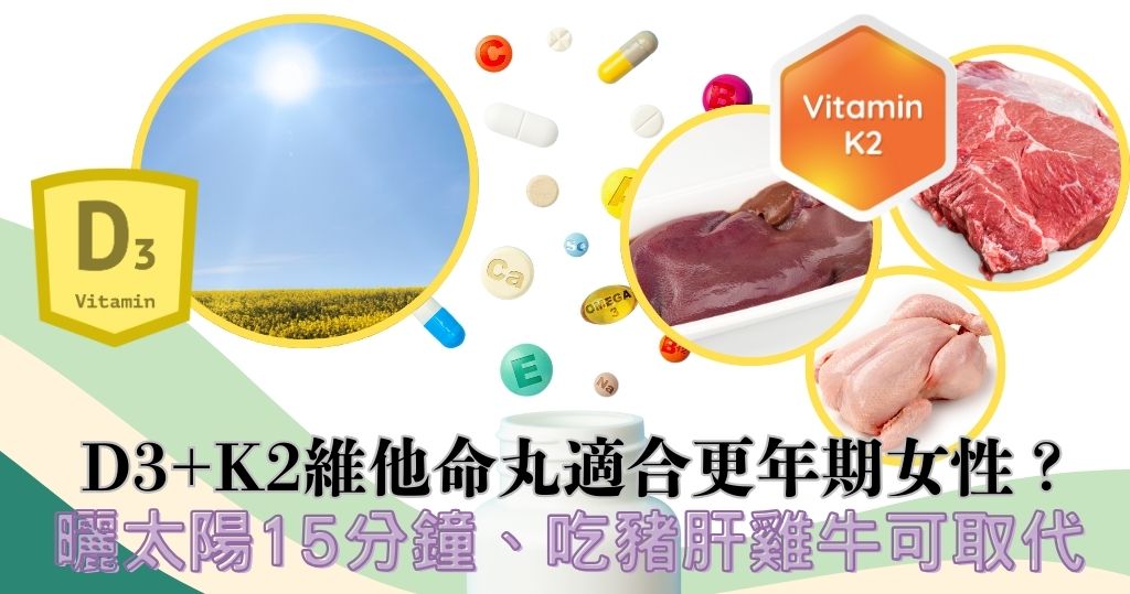 近年不少中年女士流行一併服用維他命D3及K2,盼預防骨質疏鬆,澳洲註冊營養師、Nutri Life營養顧問中心執業的韓希兒(Ally)稱,雖然有研究指出,這個維他命組合能改善更年期女士的骨質密度,防止鈣流失,有助預防骨質疏鬆,不過透過曬太陽及食肉類攝取亦一樣有效。