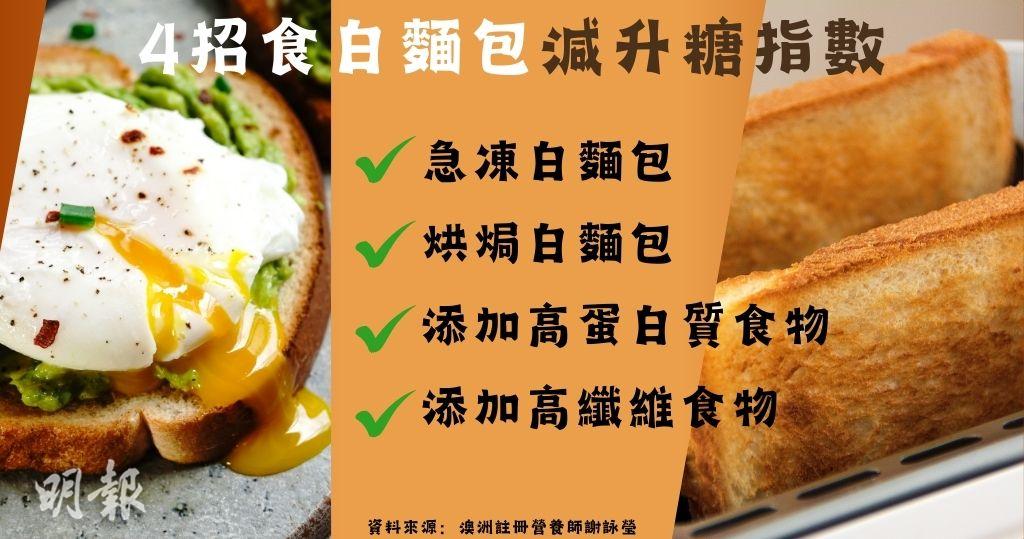 白麵包或多士是糖尿病人或需要控制體重人士的「天敵」?澳洲註冊營養師、Nutri Life營養顧問中心營養師謝詠瑩(Gloria)說並不一定,她引述兩份英國Oxford Brookes University(牛津布鲁克斯大學)研究指出,只要將白麵包急凍或烘成多士,食用後的血糖升幅會減低至少兩成至三成;若白麵包配合高蛋白質的食物例如芝士,也能將升糖指數減低三成。血糖過高會令身體分泌過多胰島素,儲存更多脂肪、減慢脂肪燃燒速度。較健康之選是高纖維全麥麵包,有豐富維他命B雜及抗氧化物,又可減慢血糖吸收。