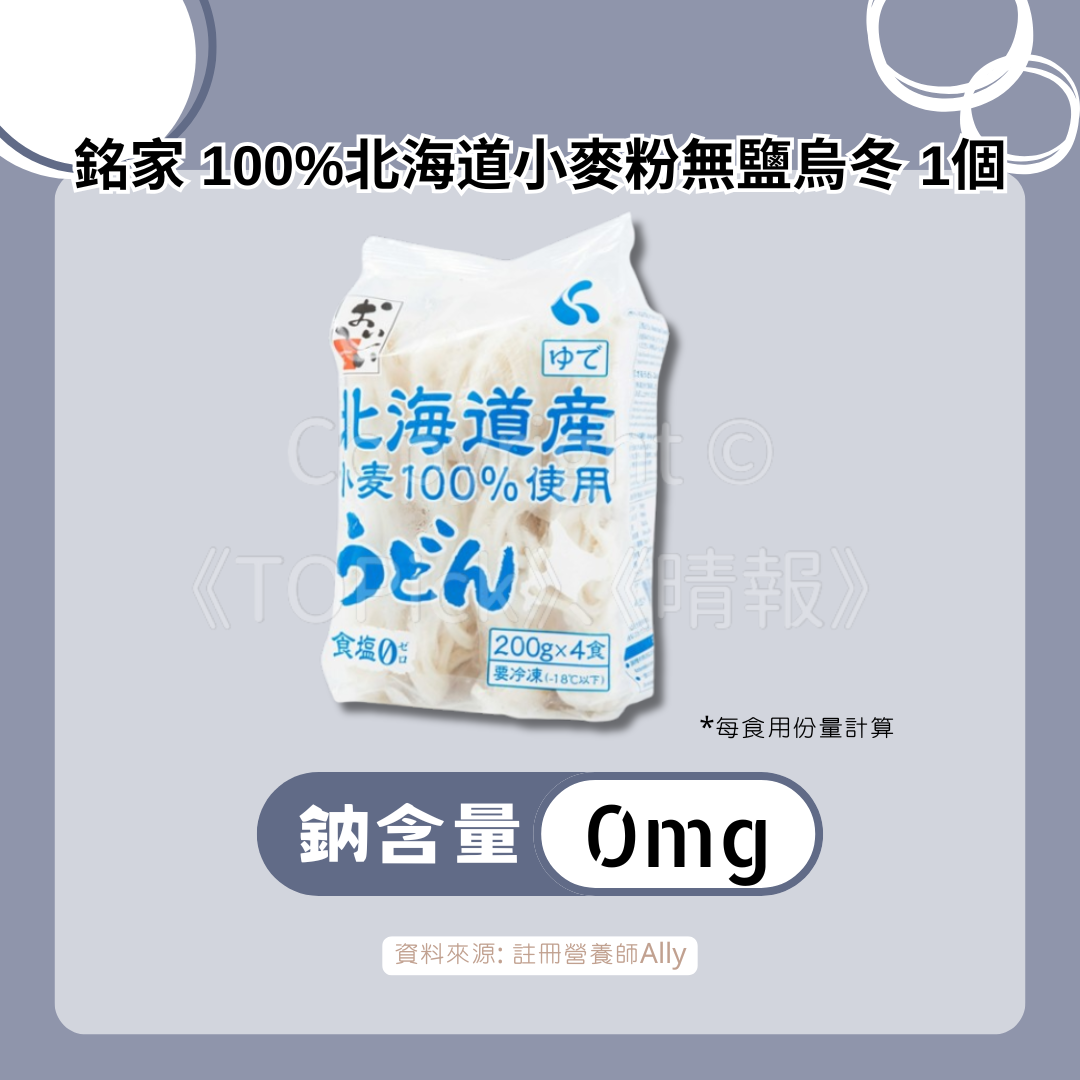 在零鹽烏冬中,Ally推薦最好味的1款「銘家 100%北海道小麥粉無鹽烏冬」;另外,「TOPVALU讃岐烏冬」同樣好味,每個(110g)含鈉213毫克,可以間中淺嘗。