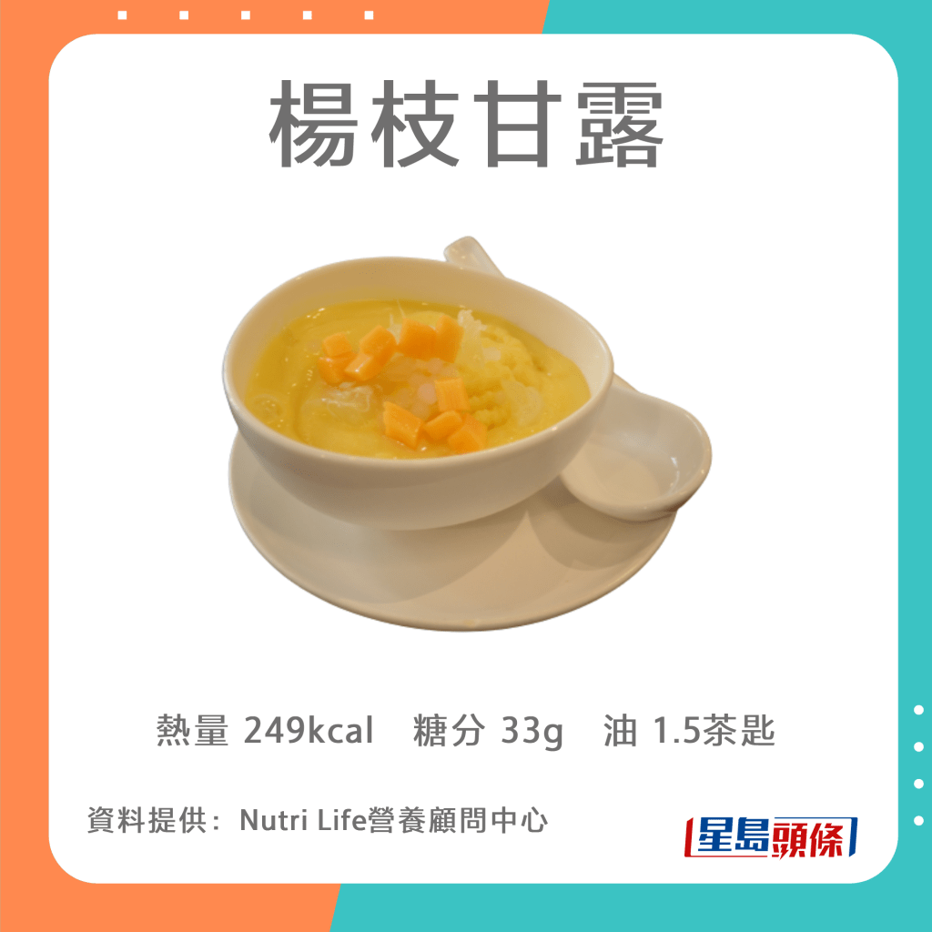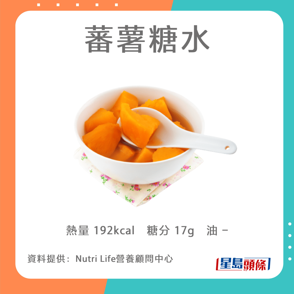 至於糖分方面,每款介乎17克至33克之間,蕃薯糖水的糖分相當於4粒方糖,綠豆沙相當於6粒方糖,楊枝甘露相當於7粒方糖,芝麻糊相當於6粒方糖,合桃糊相當於5粒方糖。而油方面,則介乎1.5茶匙至5茶匙,其中只有蕃薯糖水、綠豆沙為零。