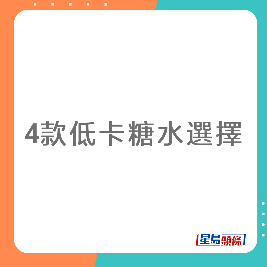 兩位營養師亦推介4款低卡糖水。《星島頭條》記者根據香港食物安全中心數據資料庫及Nutri Life營養師提供的資料,綜合如下:同樣以每碗約300克計算的話,熱量方面,每款介乎129kcal至193kcal之間,而糖分方面則介乎19.2克至23.7克之間。
