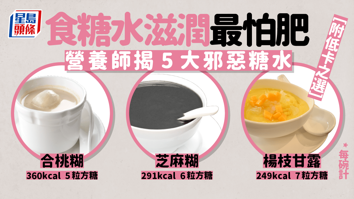 秋風起,天氣乾燥,不少人都愛食糖水助滋陰潤肺,但要注意所隱藏糖分及油脂,以免致肥。「Nutri Life營養顧問中心」註冊營養師李珮璇(Wendy)及楊盈希(Hayley)近日在「eat.well.nutrition」instagram上分享片段,分析5款熱門中式糖水的熱量,包括蕃薯糖水、綠豆沙、楊枝甘露、芝麻糊、合桃糊,同時推薦4款低卡選擇,供各位減肥人士參考。