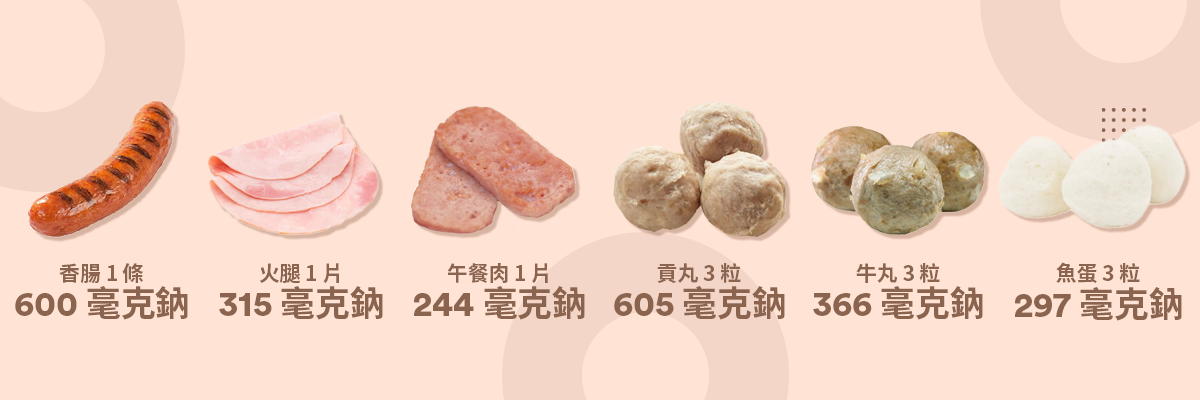 包括香腸、火腿、煙肉及各類火鍋料 (如肉丸、魚蛋、牛丸),在製作過程中通常會添加大量鹽分以延長保質期及增添風味。
