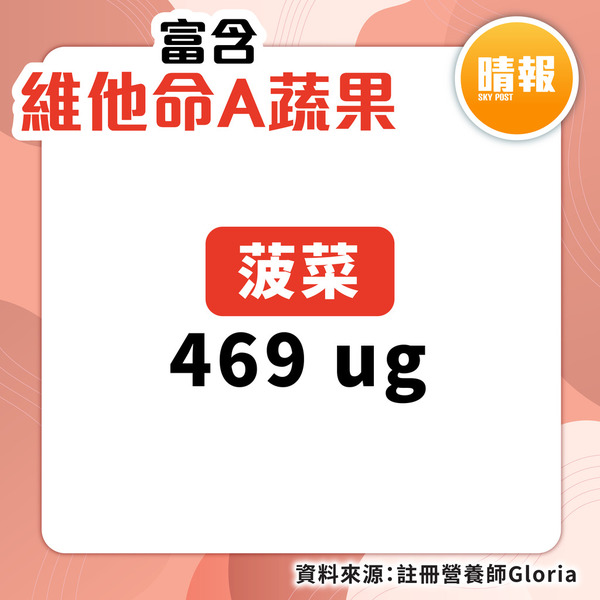 Gloria表示維他命A可幫助上呼吸道黏膜分泌,抵擋細菌病毒經呼吸道入侵;而且可以增加體內白血球數量,增強免疫力。她提醒食適量橙黃色及深綠色蔬菜,當中的胡蘿蔔素會轉化做維他命A。