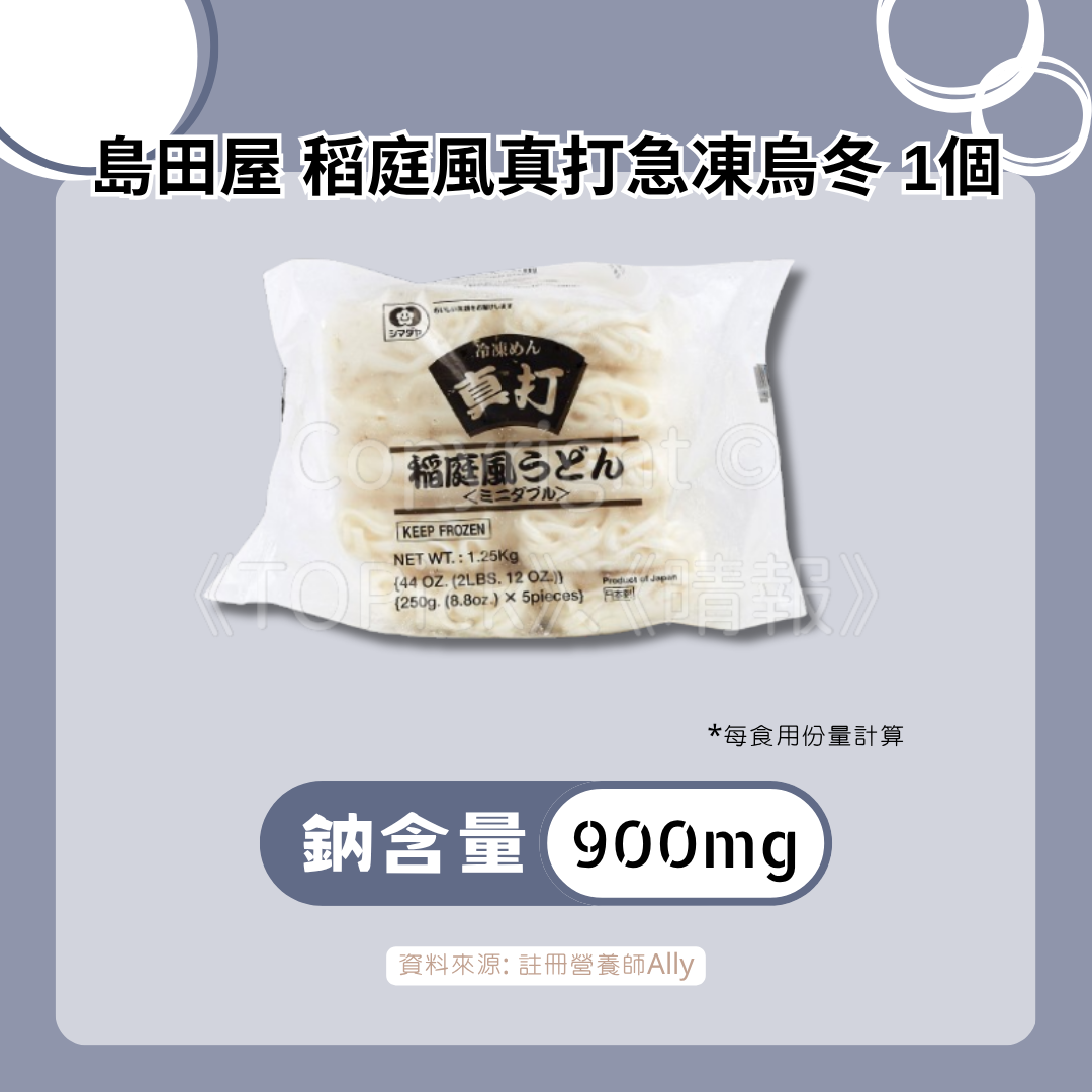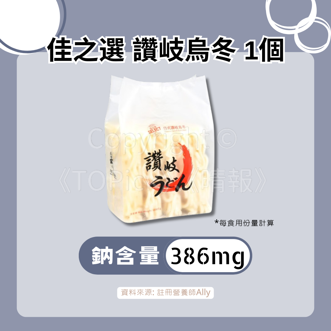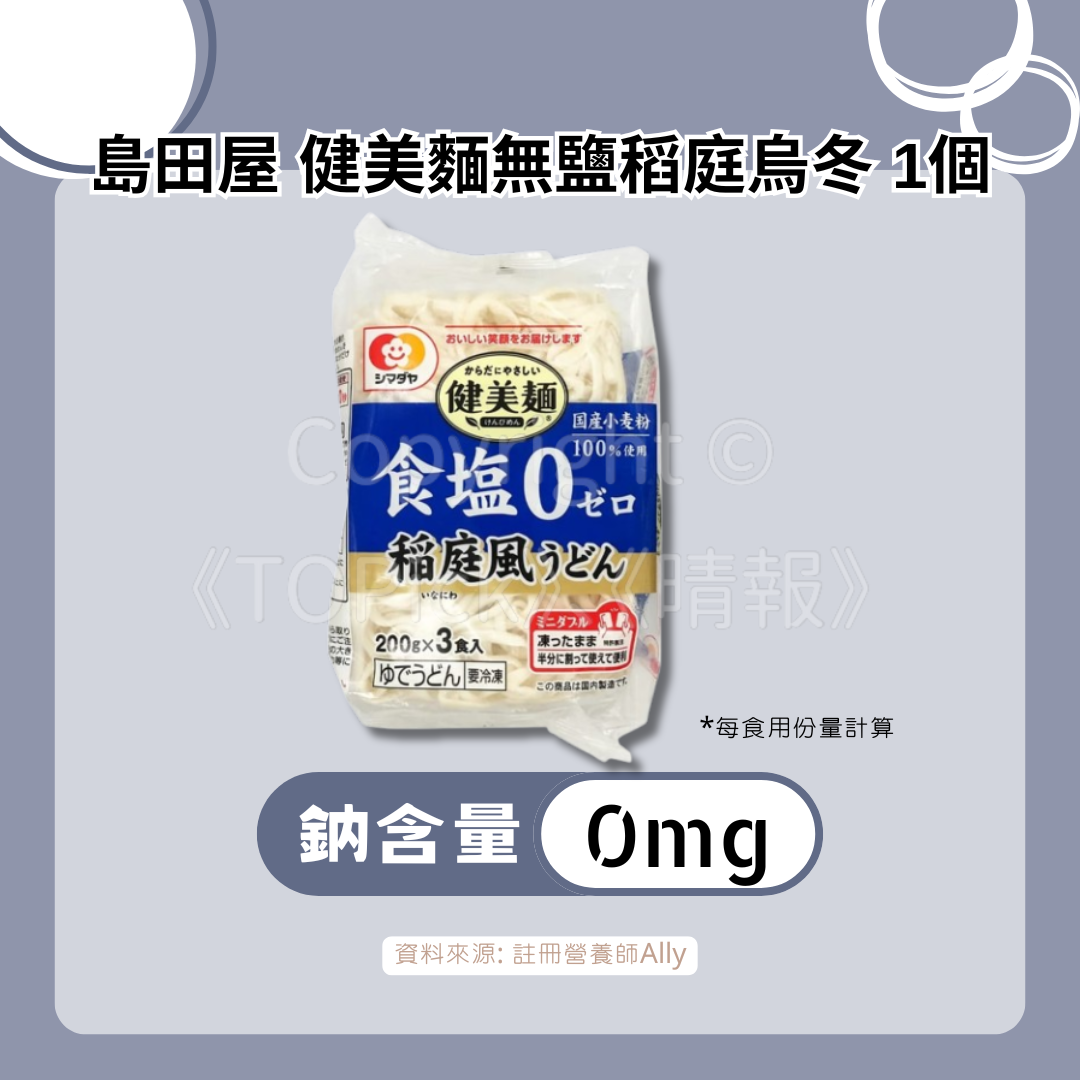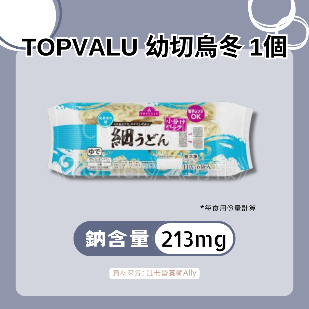 在零鹽烏冬中,Ally推薦最好味的1款「銘家 100%北海道小麥粉無鹽烏冬」;另外,「TOPVALU讃岐烏冬」同樣好味,每個(110g)含鈉213毫克,可以間中淺嘗。